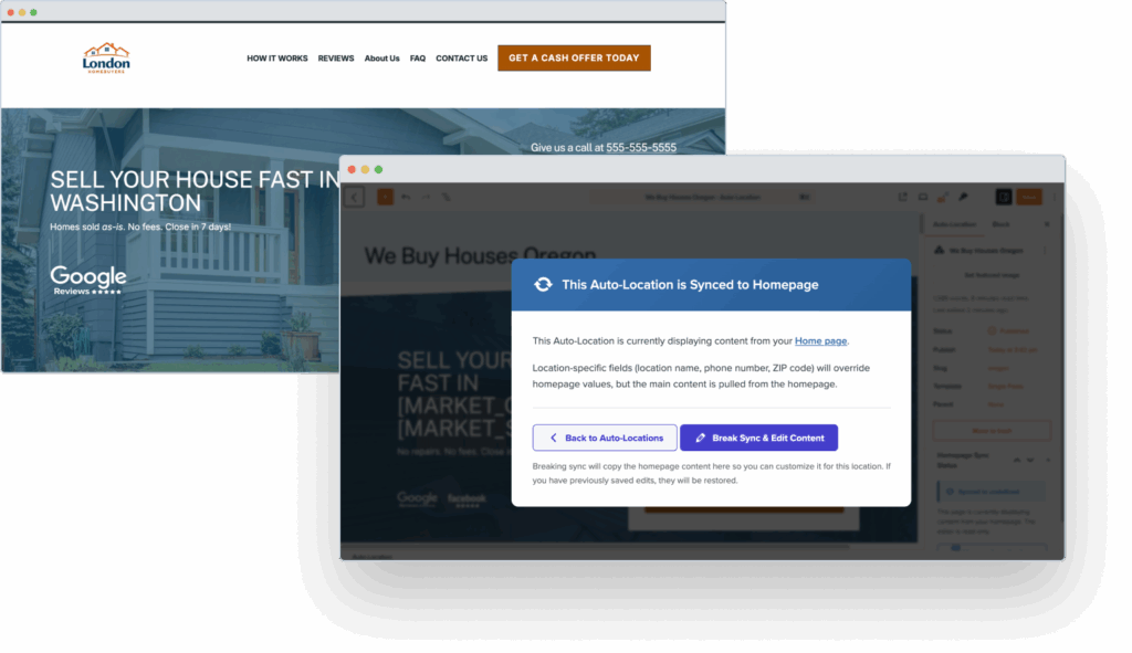 You can link all your location pages for easy one-click updating, but you can also customize each page to really personalize it to that area. Original content that shows knowledge and expertise is important for SEO and building trust with leads. Customize your pages with local data, images, talking points, and client testimonials to show up in AI/search and generate more motivated leads.