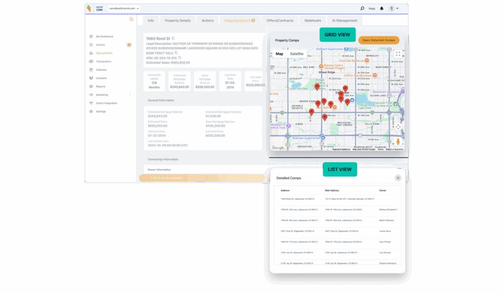 Stop wasting hours collecting property data from dozens of sources. Or worse … making a bad deal because you don’t understand nearby comps. CarrotCRM gives you the info you need on a single screen.
