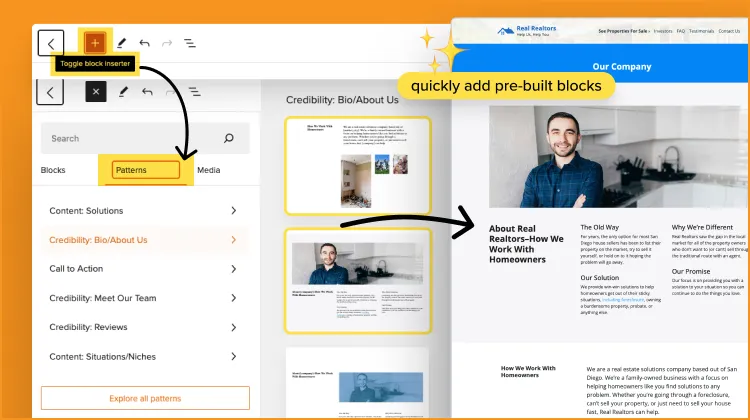 Drag and drop editors are a common feature with most website builders, and Carrot is no different! Quickly and easily customize the look of each webpage with Carrot’s drag and drop editor. Choose from dozens of pre-built section layouts (called patterns) for fast customization.